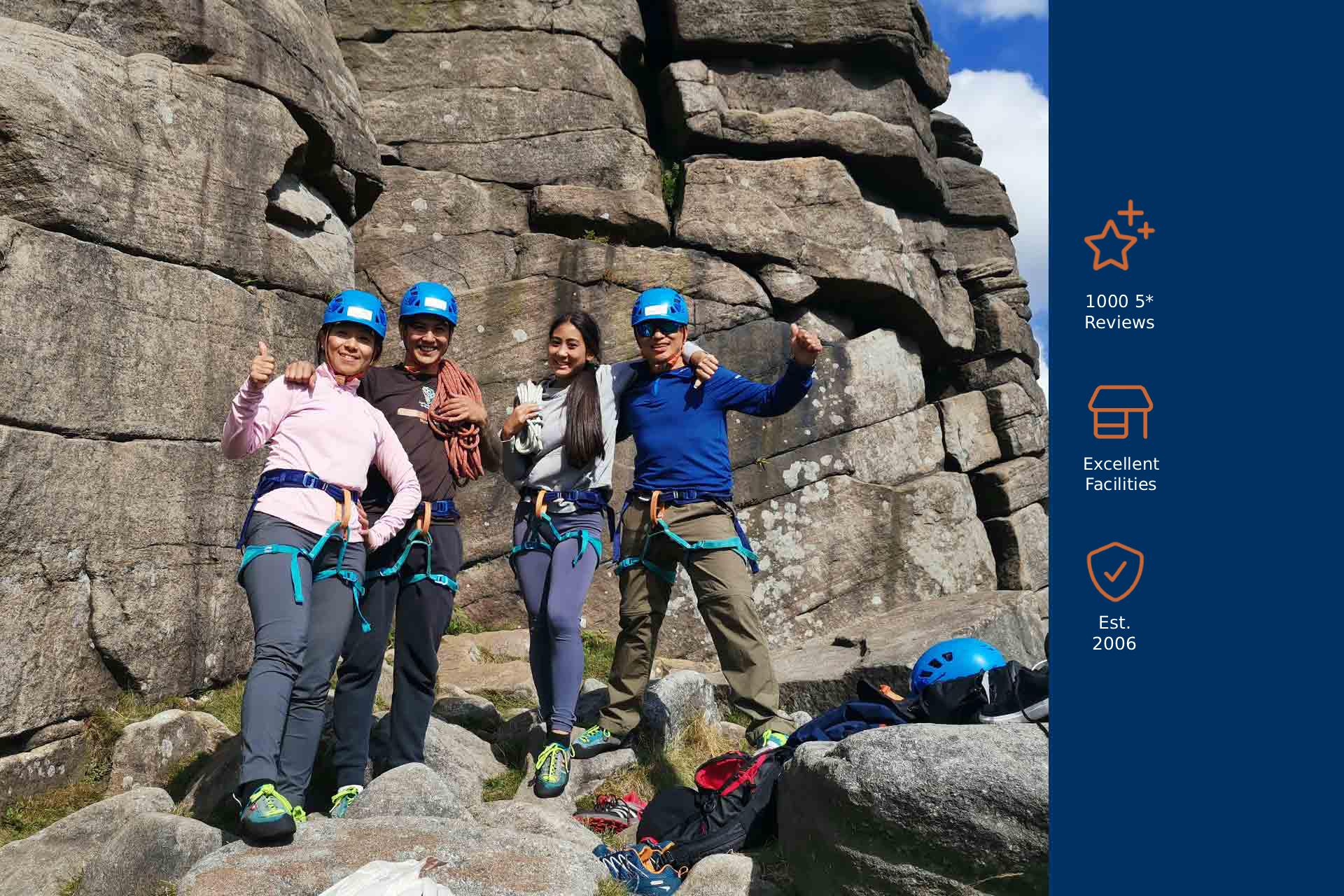 Our Beginner Outdoor Rock Climbing Course is the perfect way to experience climbing on real rock for those with little or no prior experience. Being based in the Peak District we have easy access to some of the best rock climbing in the UK which means our experienced instructors can always find the right location and level of challenge for you. This course is therefore just as suitable for complete beginners who have never climbed before as it is for those who have previously climbed indoors and are looking to refresh their skills or get a taste of climbing on real rock.